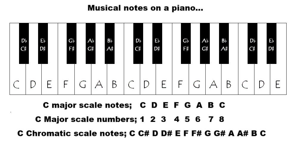 black notes! The black note between C and D , could be called either C# (sharp) or Db (flat). To keep things simple, lets just use #sharps for now.